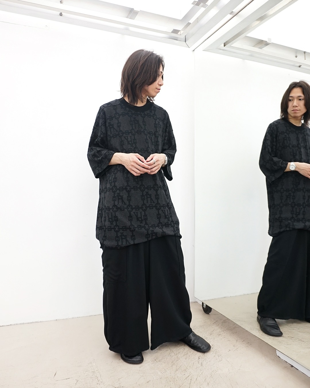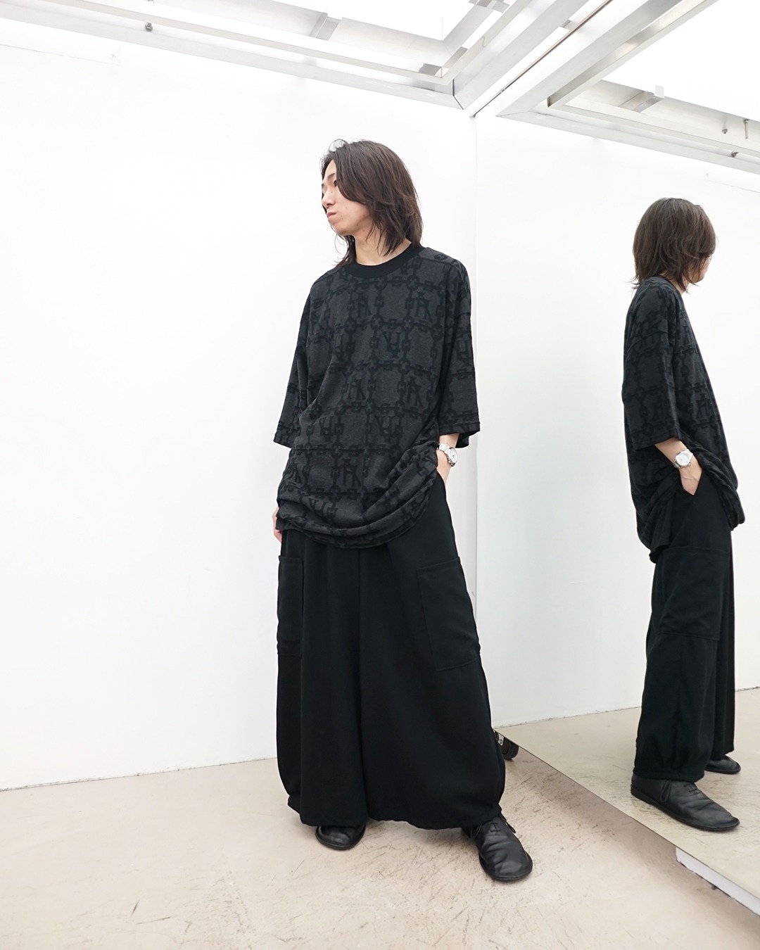 ジャカード織りによって生まれる表情が何とも言えない存在感を放っていますオーバーサイズTシャツです。ジャカードというと重たい印象を持つかもしれませんが、A.Fらしくテクスチャーの奥行きはしっかり残しつつも、生地は非常に軽くて肌離れもよいのが特徴。通気性に優れた素材構成で、汗をかいてもまとわりつきにくいのも夏場には嬉しいポイントです。シルエットは、A.Fらしい大胆なドロップショルダーと、程よくボリュームのあるワイドフォルム。袖丈や着丈もたっぷりと取られているので、レイヤードにおいても主役として映える一枚です。