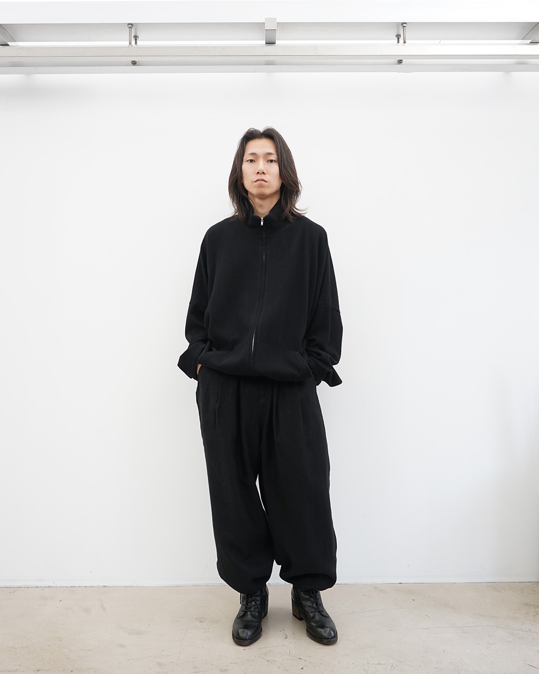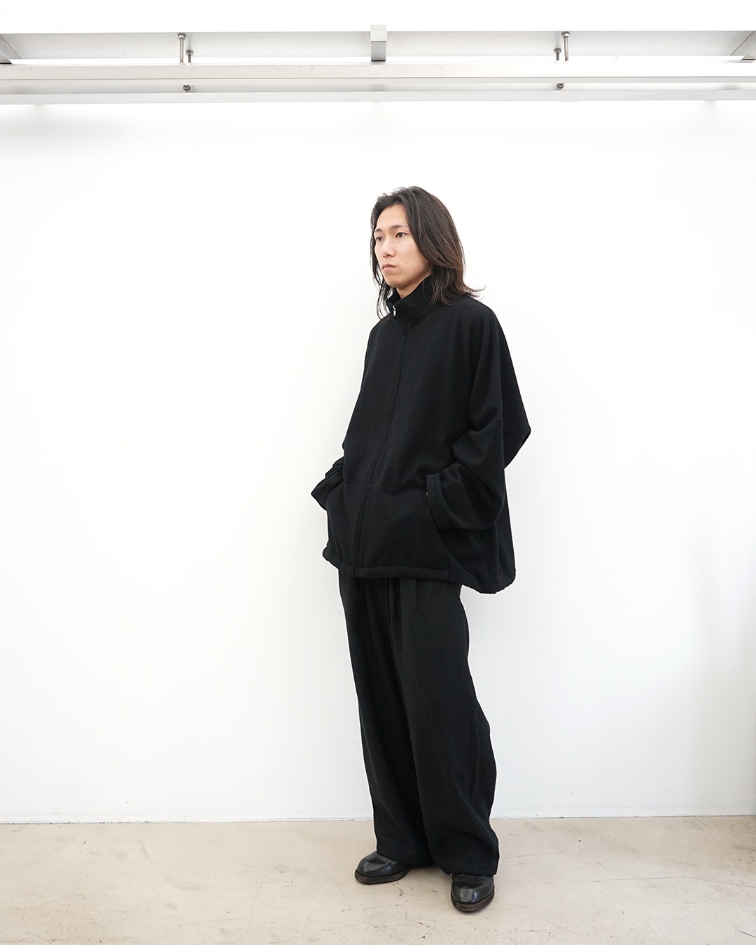 デザインは、スポーティなジップアップブルゾンをベースにしながらも、シルエットと素材の力で全く異なる表情に昇華しています。ジップ自体もコンシーラー気味にすることで、ジップが持つギラついた表情を抑制しており、アイテムそのものの主張が出過ぎないようになっております。そしてわずかに立ち上がるスタンドネック、肩を落としたリラックスシルエットのバランス。一見ミニマルなのに、すべての線が緻密に計算されていて、身体を包み込んだ時のシルエットの美しさが際立つ1枚です。
