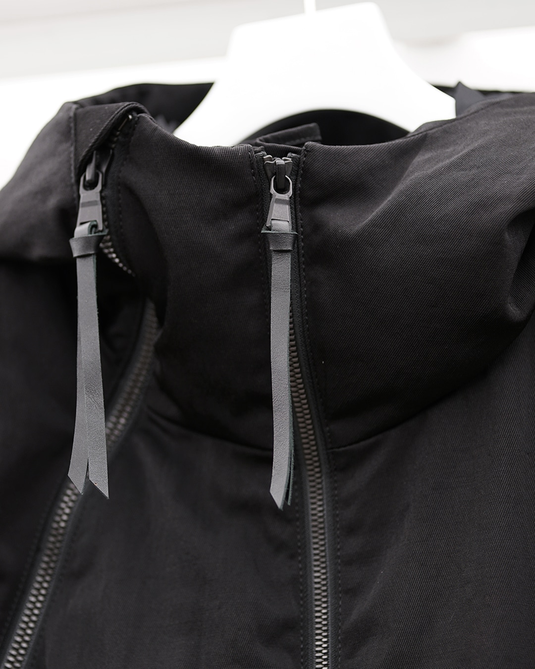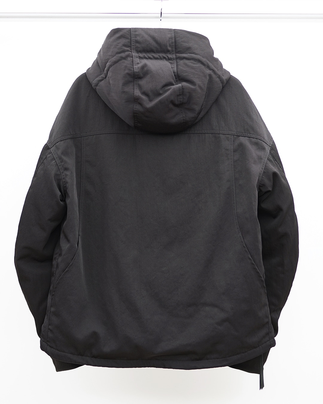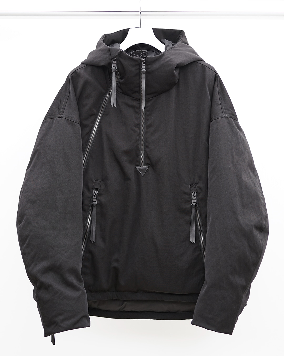 軽撥水も兼ねているため、急な小雨にも対応。各所に配置されたジップやレザーの引き手がデザインとなり、ミニマルながらも力強い印象があります。全体は直線的なパネル構成で、肩を大きく落としたリラックスシルエット。どこか建築的な佇まいを感じさせますが、着用するとその構築的なフォルムが自然に身体に馴染むよう計算されております。そして特徴的なのは、やはりこのジップ。アノラック型ですがセンターのジップ横に配置されたジップで開閉することで、被り構造であるはずのアノラックジャケットを羽織ることができます。