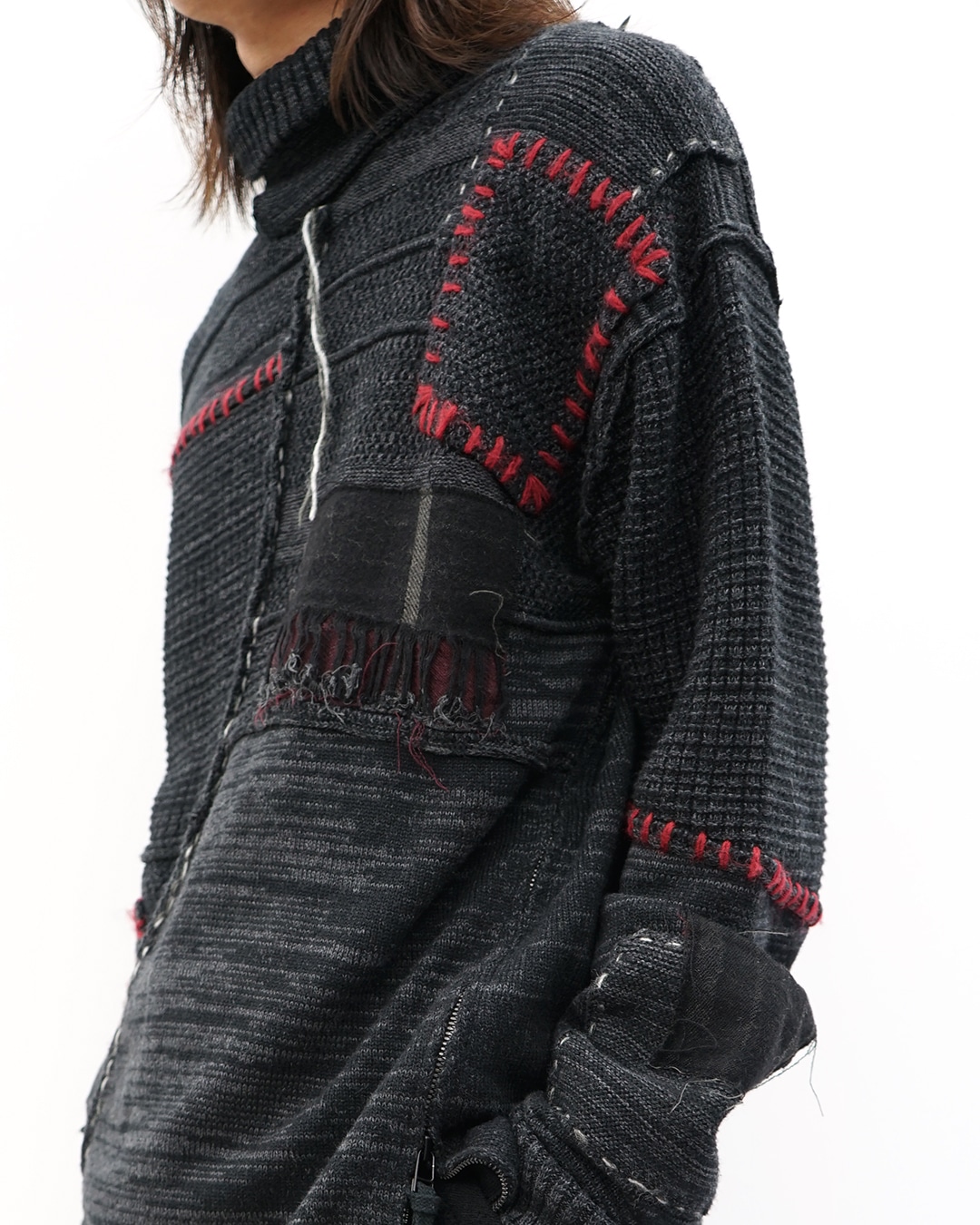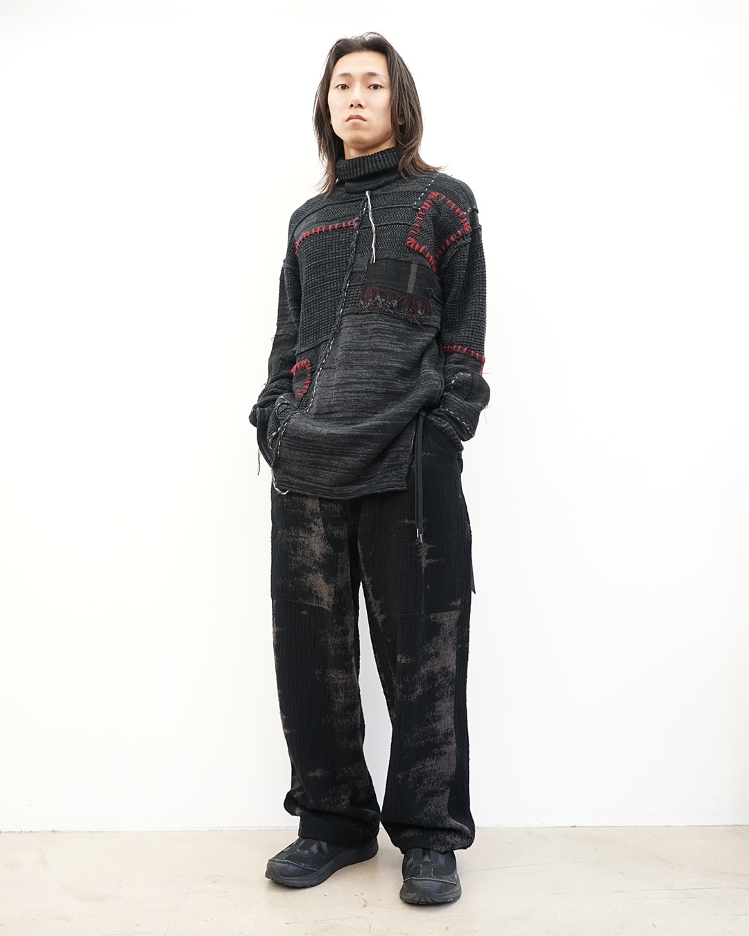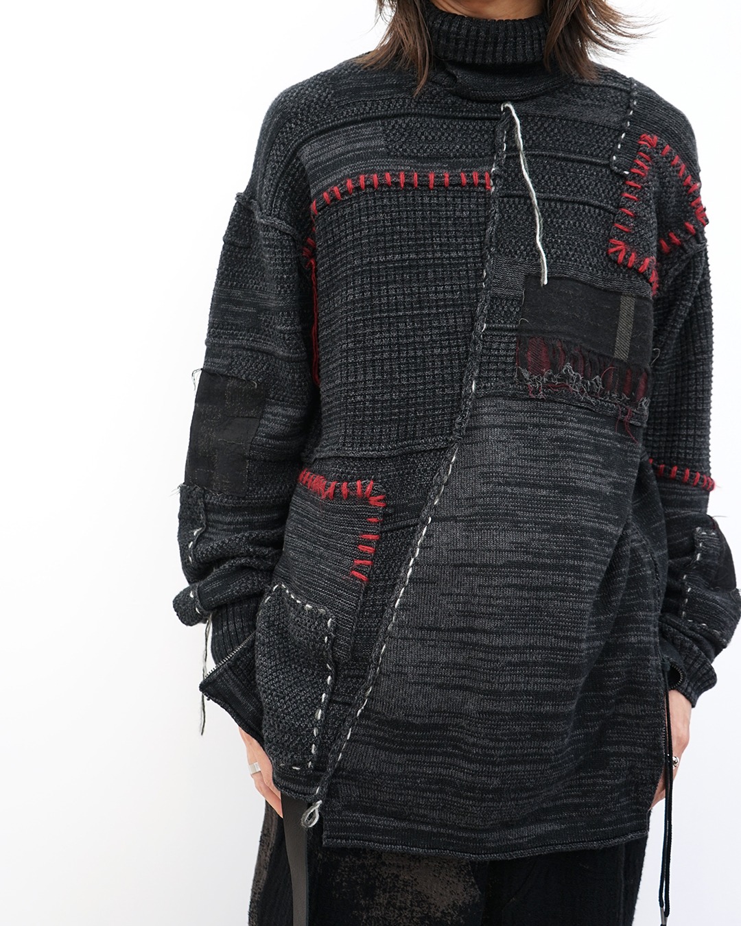 ブランドらしい、構築的で無骨ながらもどこか儚い空気を纏ったニット。素材はコットンにカシミヤをつなぎで混紡したものを使用。ドライな表情と柔らかな肌触りを両立させています。大きなデザインとして目を引くのは、ダメージ加工ではなくリペア加工。これによって時間の経過が入り込んだような表情の緩急が生まれます。「1枚で完成するニット」というのは例年人気ですが、この手のニットは当店でもその人気は相変わらずです。