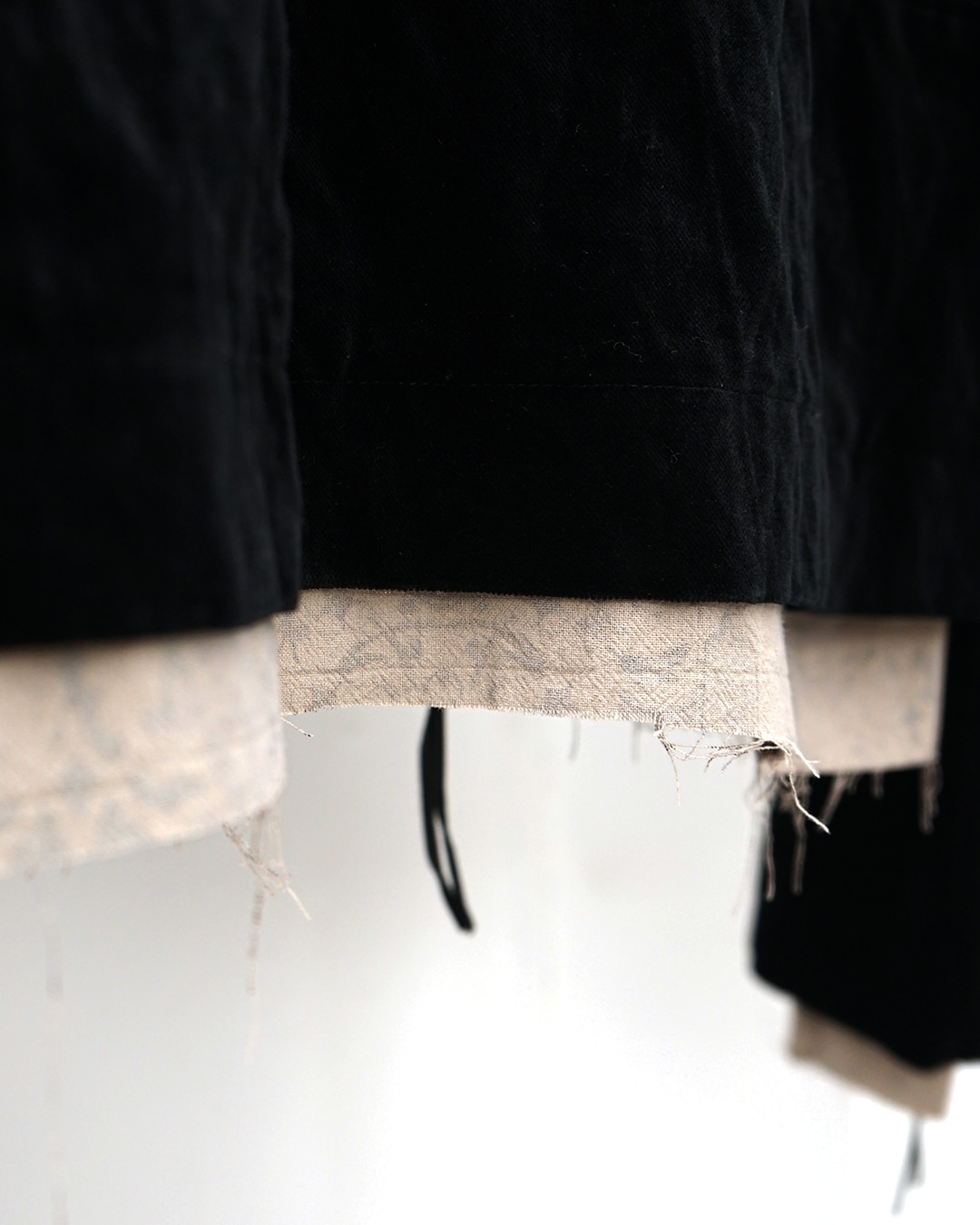 こちらは先ほどのジャケットど同様のパターンで生地違いになります。ヴェルヴェットになるだけで、もはや全く別物の気配を感じますね。上品でエレガントで、デニムで合わせてカジュアルに持って行ってもいいし、スラックスでさらにエレガント要素を強くしてもカッコ良い。意外と選ばれにくいテキスタイルかもしれませんが、臆せず着用していただくとその素敵さに気づいていただけるはず。