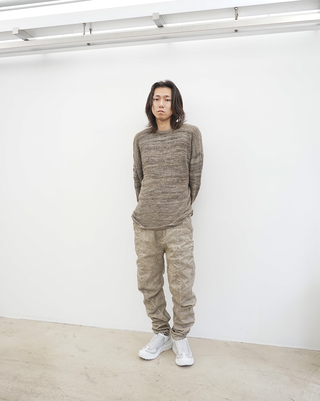 着るとまず感じるのは、圧倒的な軽さですよ。めちゃくちゃ軽い。着てないんと一緒。そして手編みで作られたことによって空気を含んだ生地がストンと落ちる。そして微かにざらつく手触りが、自然素材らしい暖かみのある雰囲気を与えてくれます。そして実際に暖かいです。ゆったりとしたフォルムでありながら、首元や袖、裾のステッチワークも、どこか工芸的な精度を感じさせる。人の手の温度を閉じ込めたような一着です。このラインらしい、まさにアイテムというよりもプロダクトと呼ぶにふさわしい仕事ぶりを感じますね。