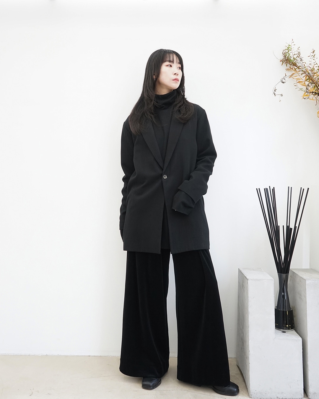 まずは、kujakuの象徴ともいえるワンボタンのテーラードジャケットから。kujakuの服には、明確な主張よりも気配が宿りますね。このジャケットも同様で、無駄な線を削ぎ落とすことで逆に存在感が際立っています。マットに落ち着いたファブリックは、光を吸うように陰影を描き、その表情は使っていくごとに微妙に変わります。肩は自然に落ち、身体に沿うというより流れるように形が決まる。前を閉じたときの縦の線の美しさ、後ろ姿に漂う余白。過剰な装飾はどこにもないのに、着た瞬間、空気がひとつ変わる。それが kujaku のワンボタンテーラードジャケットです。