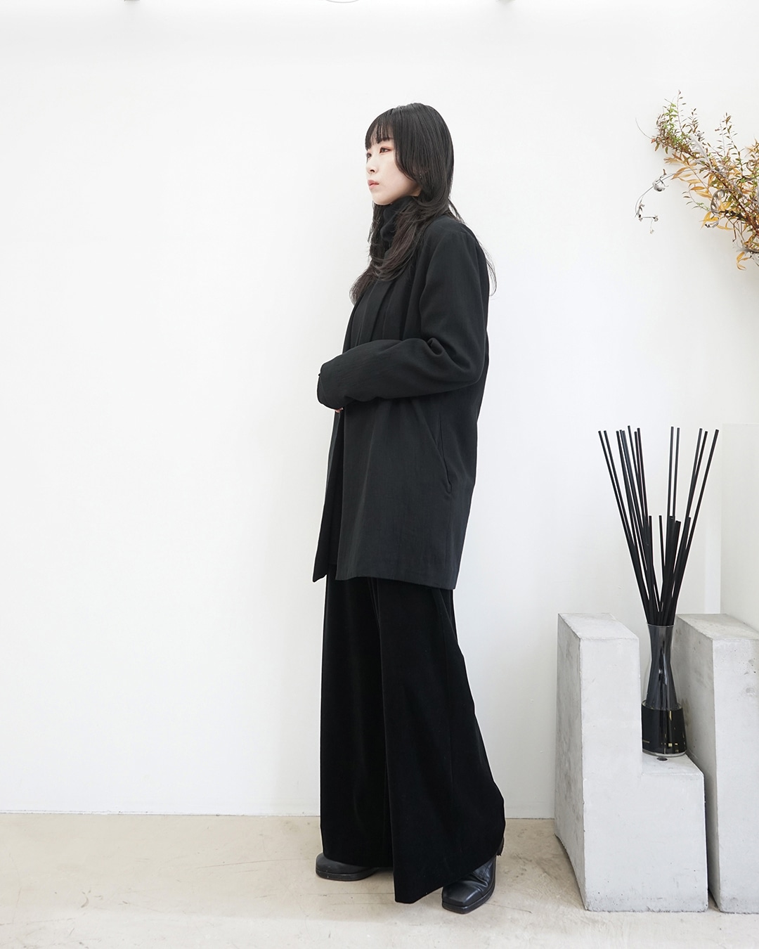 同じくkujakuのハイネックロングプルオーバーは、ジャケットの内側に静かな濃度を注ぐ役割を果たす。生地はしっとりと空気を含み、肌に触れる感覚が軽く、柔らかい。正直、この世のタートルネックのニットで一番良いプロダクトだと思っております。ハイネック部分は首からの距離、高さにおいて最も完成されたスタイルを作り出します。絵になる気配のある首元が完成しており、着丈は長めに設定され、歩くたびに縦の揺れが生まれる。布が身体に寄り添うのではなく、身体の周りに“空間”をつくるようなパターン設計。この余白こそ、kujakuの美学そのものであります。