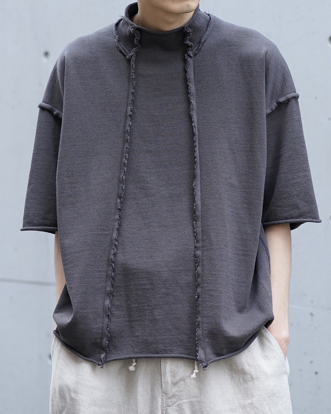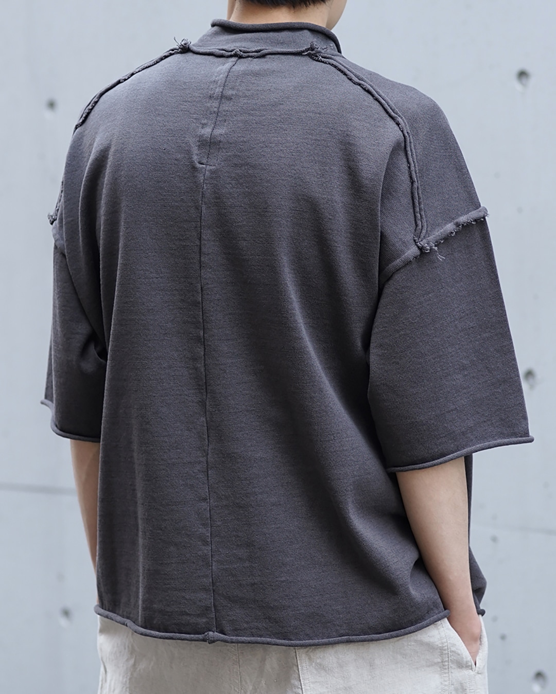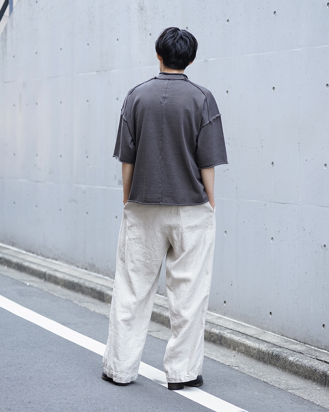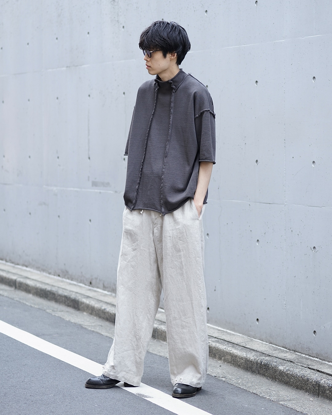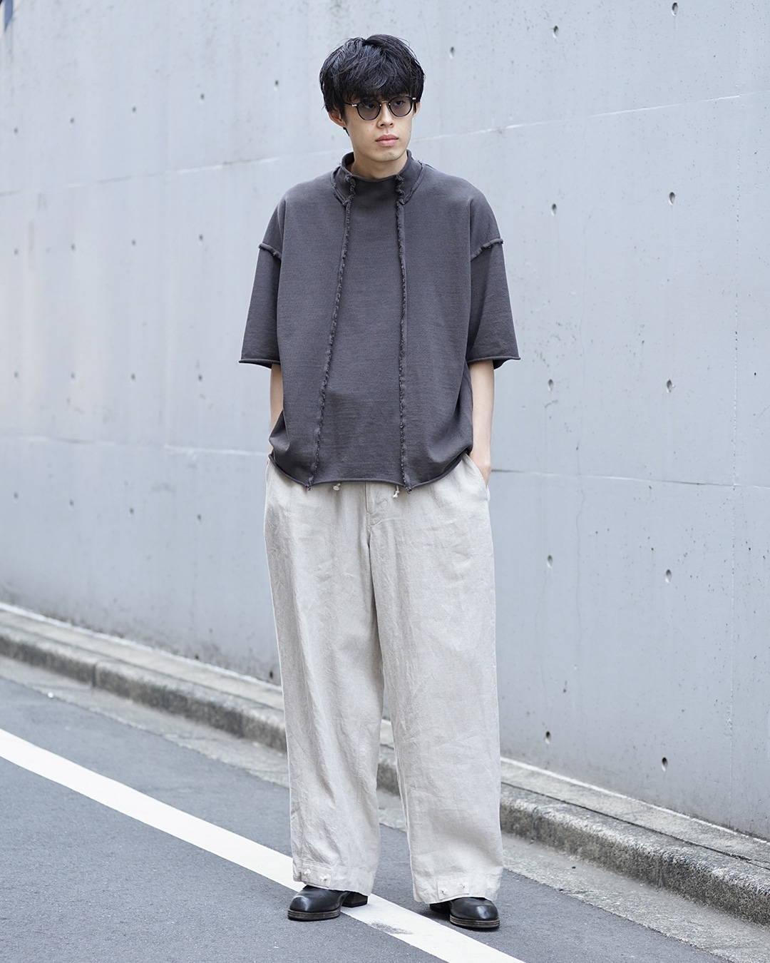 画像からも伝わる通り、フラットな天竺とは異なる、わずかにドライでエアリーな質感で、肌離れが良く、真夏でも重たく見えないんですね。