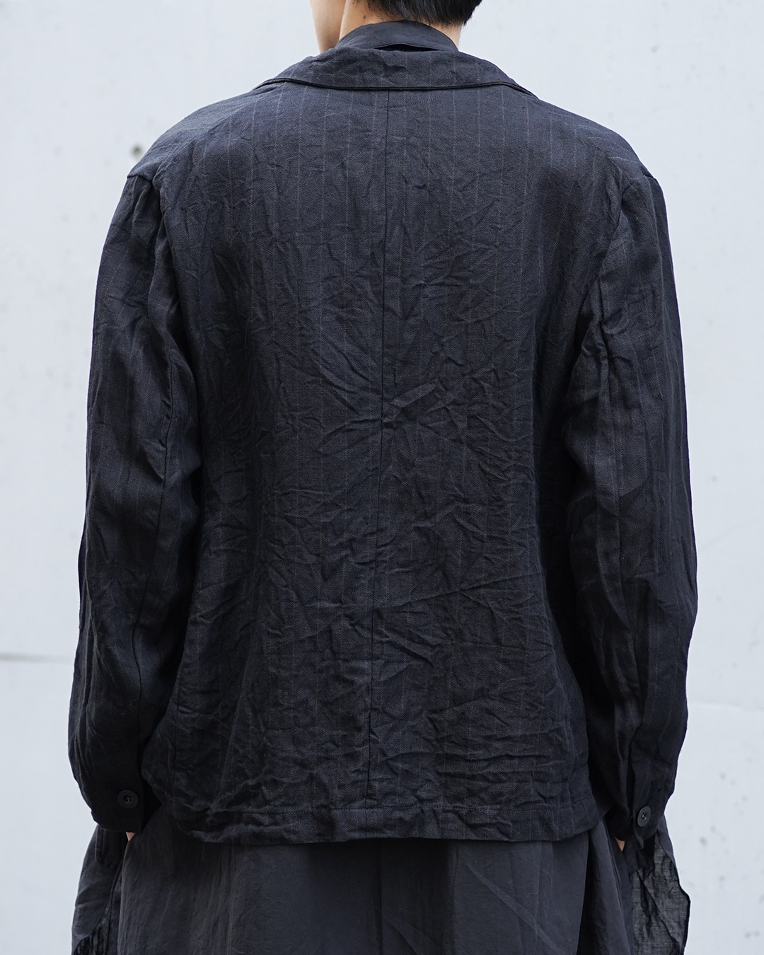 袖口のカフスも過度に主張せず全体のトーンを崩さない、バックスタイルもシンプルながら、肩周りのライン取りによって自然なドレープが生まれています。