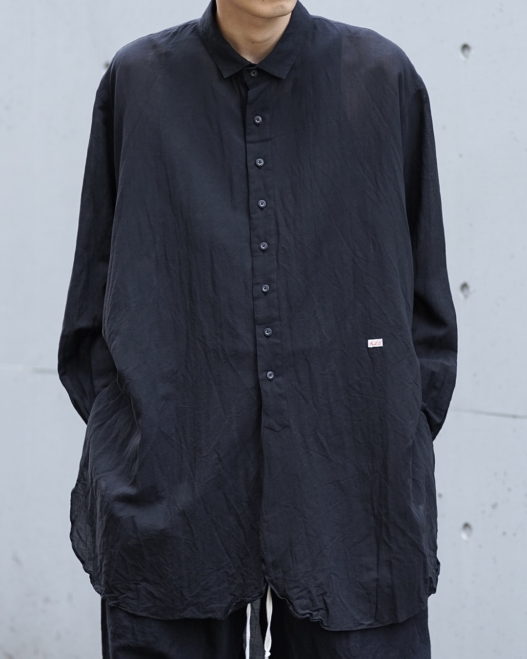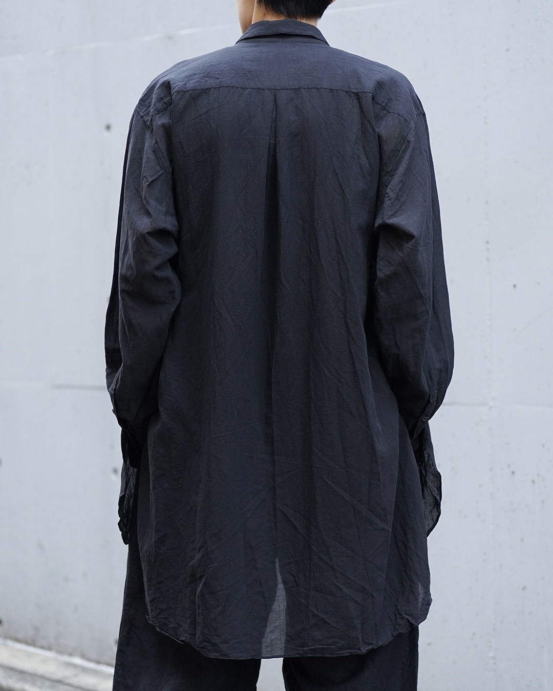常のシャツよりもわずかに長く設計され、裾に向かって自然に落ちるラインが美しい。