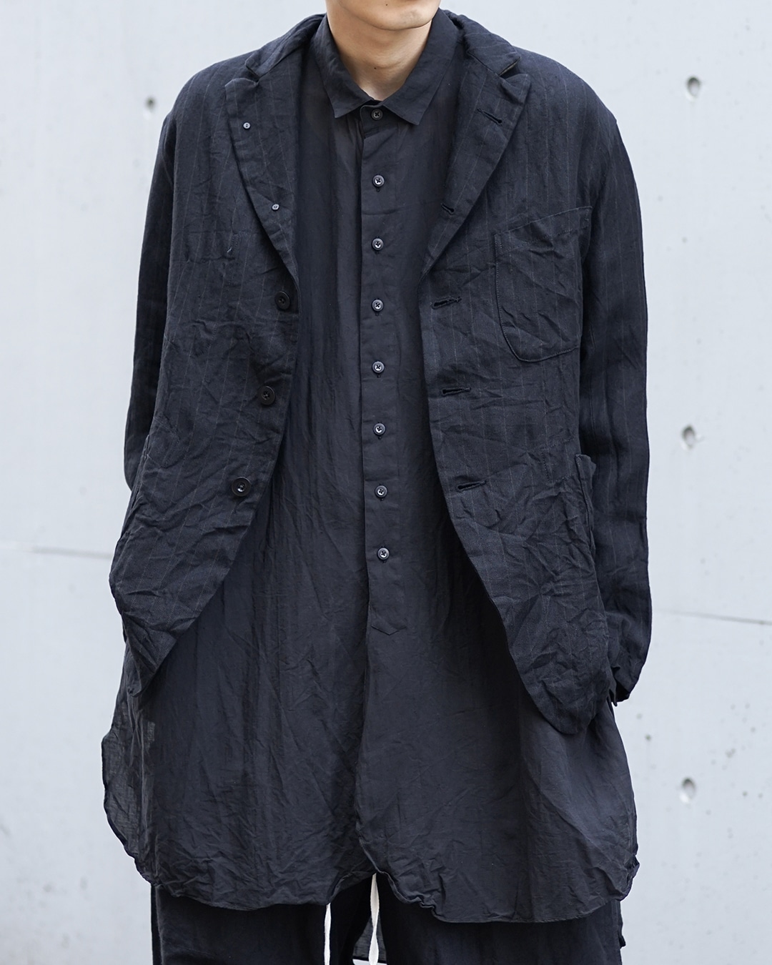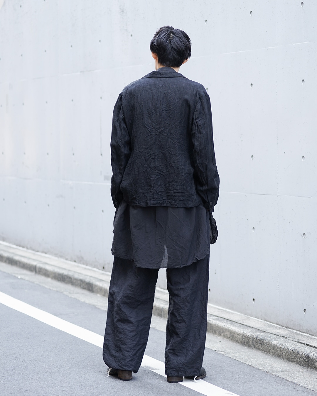 肩は強く張らせず、あくまで自然に落としたラインで、身幅には程よく余白を持たせながらも、前身頃のカッティングによって縦のラインを強調することで、立ち姿がすっと整うんですよね。