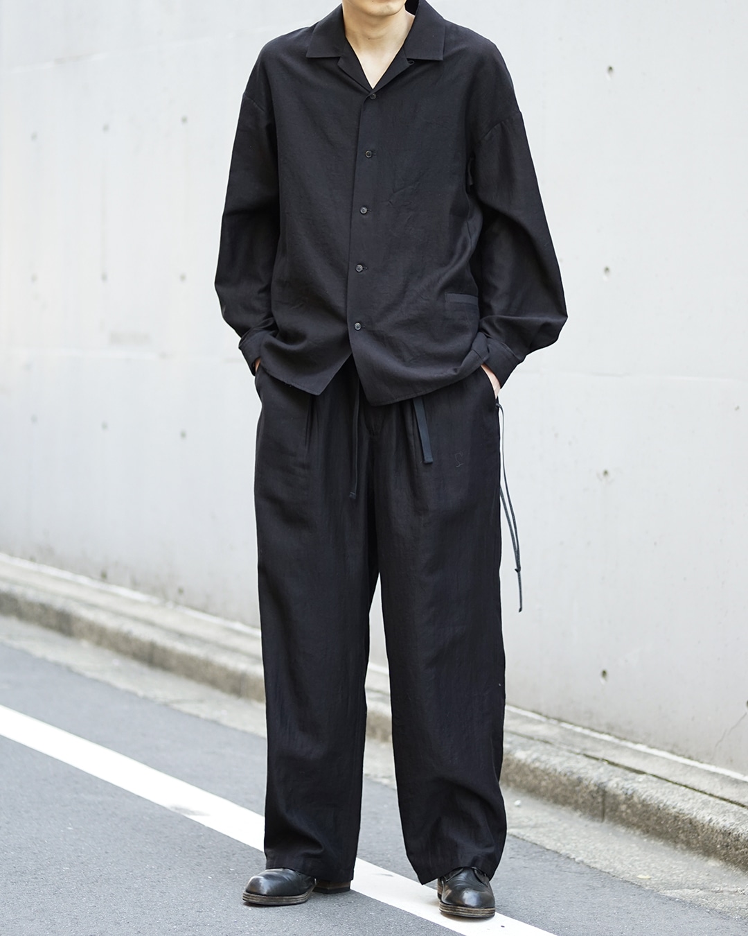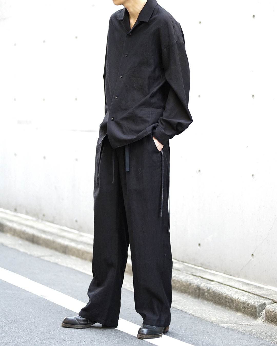 パンツ単体でも存在感がありますが、シャツと合わせることで素材の質感がより際立ち、ミニマルながら非常に強いセットアップスタイルが完成します。