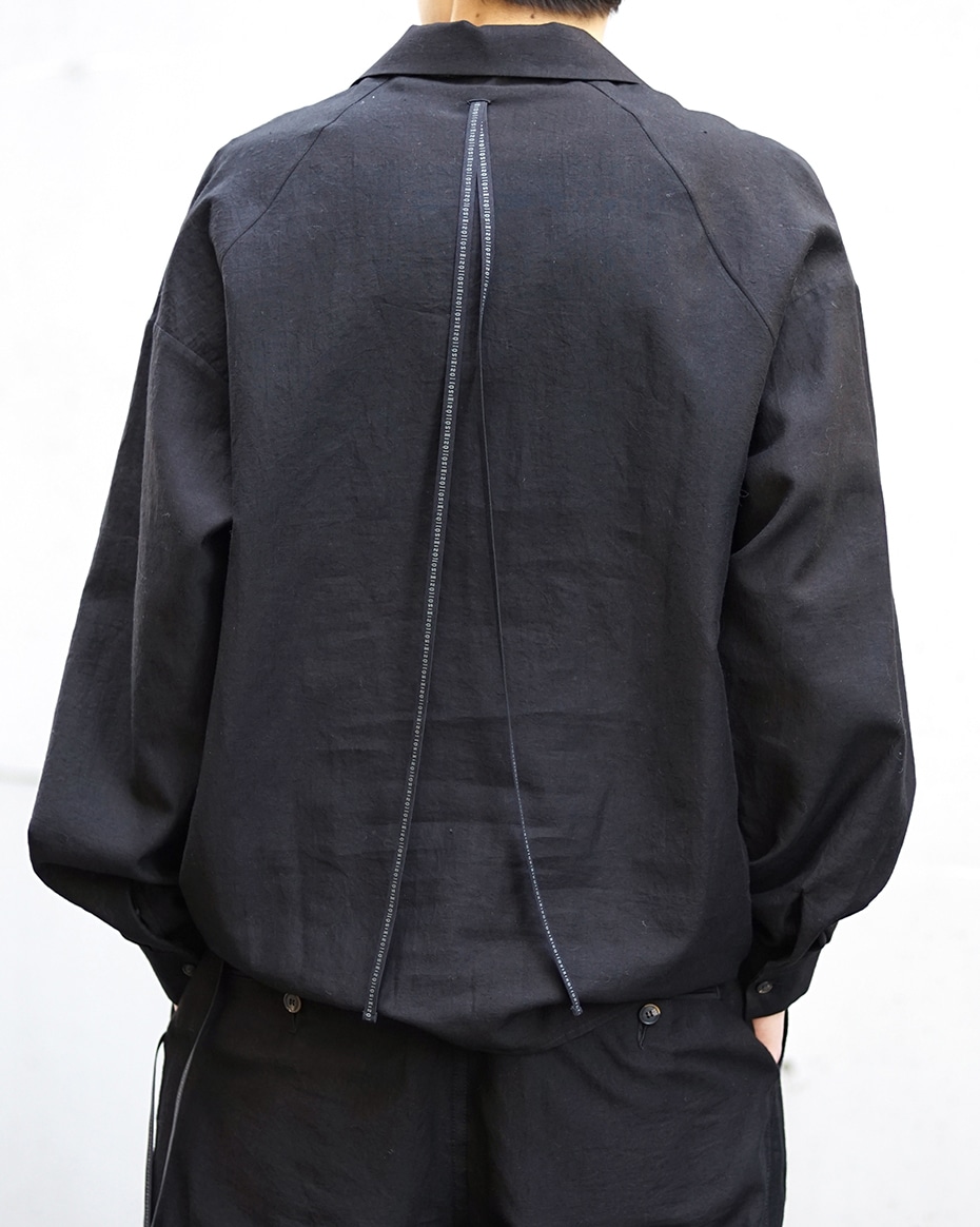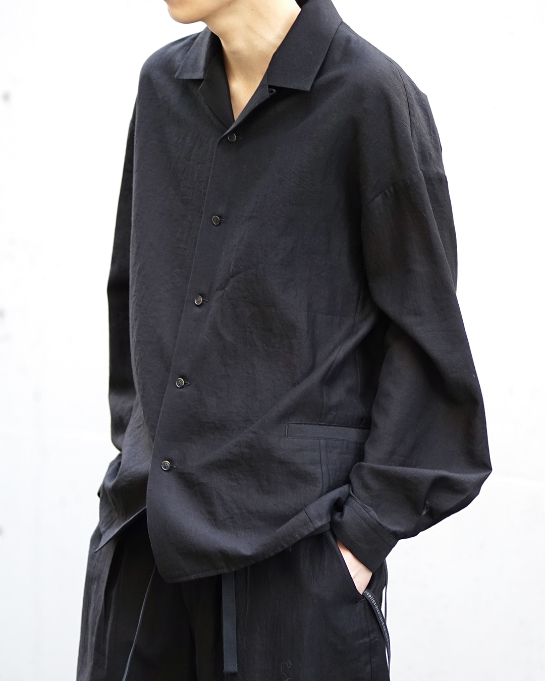 一見すると非常にミニマルなブラックシャツですが、細部を見ると通常のシャツとは明確に異なる設計が随所に見られます。