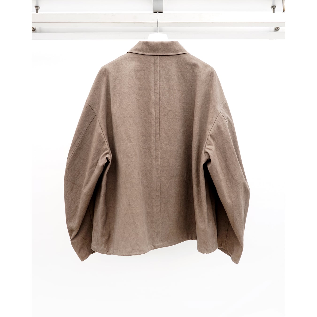 ボクシー型のフロントジップ JKT です。肩傾斜を適度に作りドロップショルダーデザイン。袖筒はパイロットJKT的なエルボー部分にボリュームを持たせています。裾にはスピンドルとストッパーを付属させ、ボクシーなシルエットからより曲線的なアウトラインへと変化させる事ができます。あわせて逆開のファスナー仕様でスタイリングに変化を加えます。