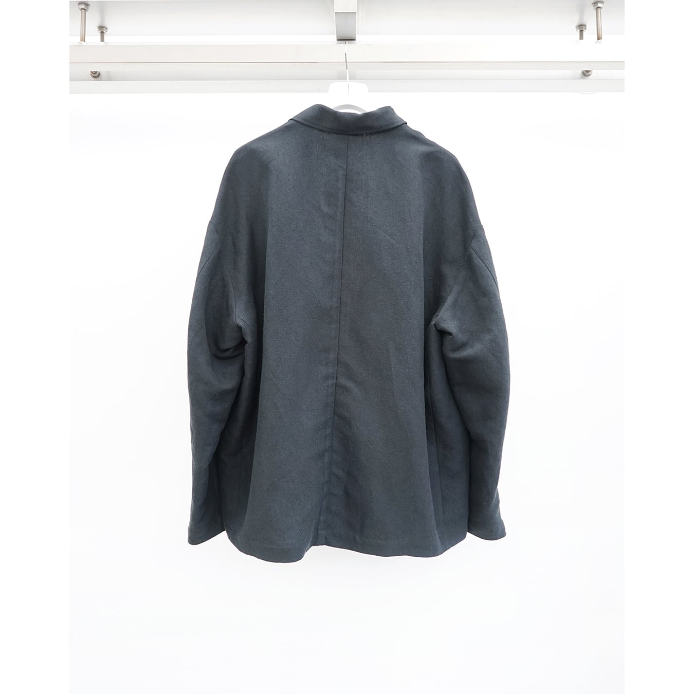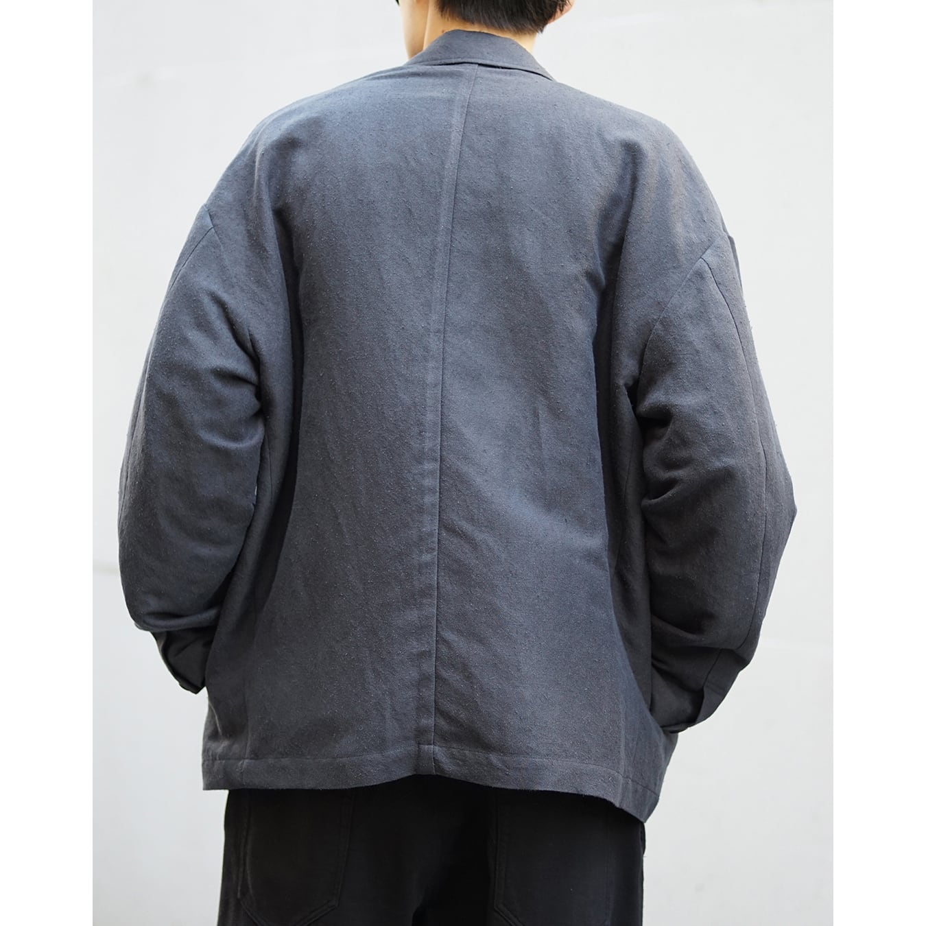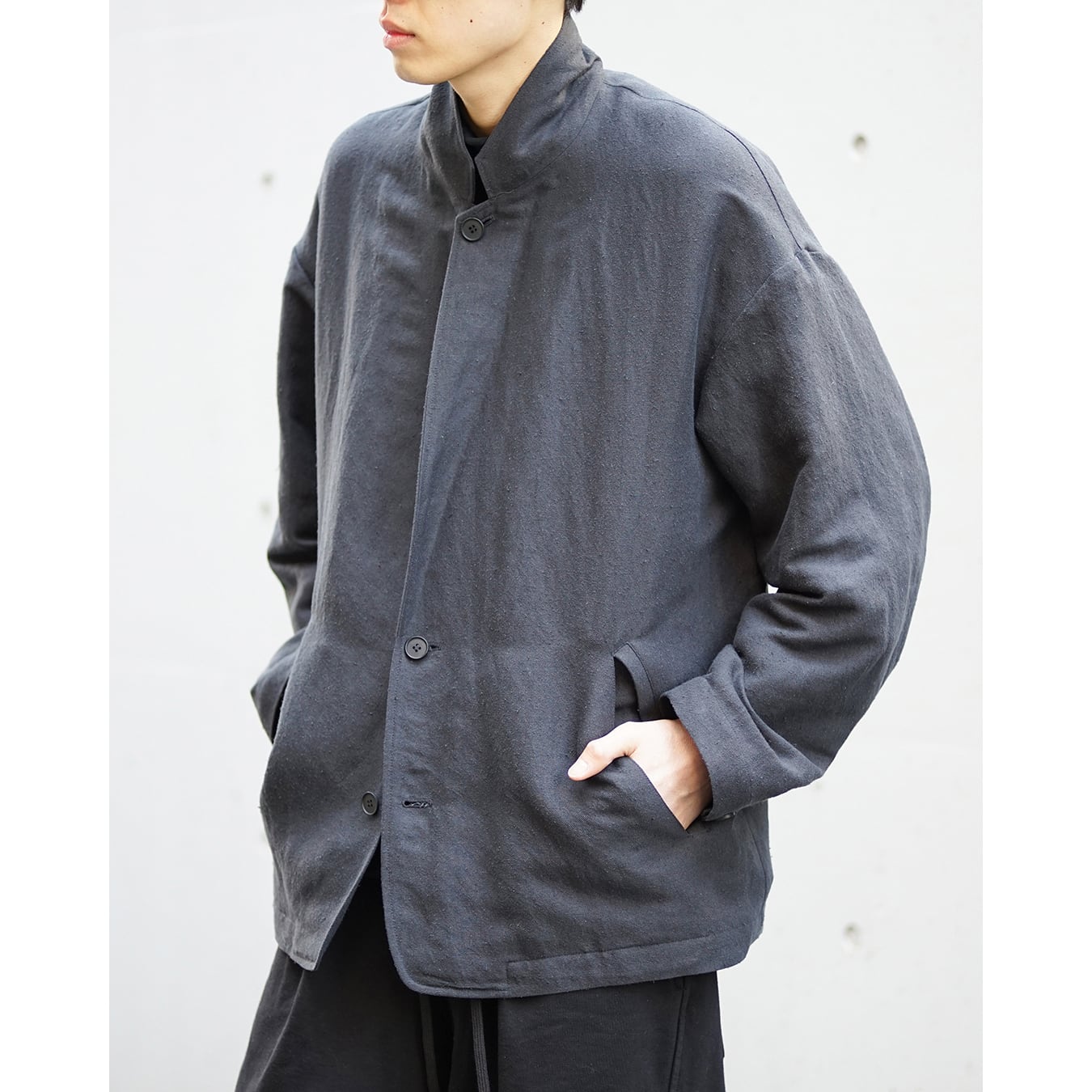 ボクシー型のフロントジップ JKT です。肩傾斜を適度に作りドロップショルダーデザイン。袖筒はパイロットJKT的なエルボー部分にボリュームを持たせています。裾にはスピンドルとストッパーを付属させ、ボクシーなシルエットからより曲線的なアウトラインへと変化させる事ができます。あわせて逆開のファスナー仕様でスタイリングに変化を加えます。