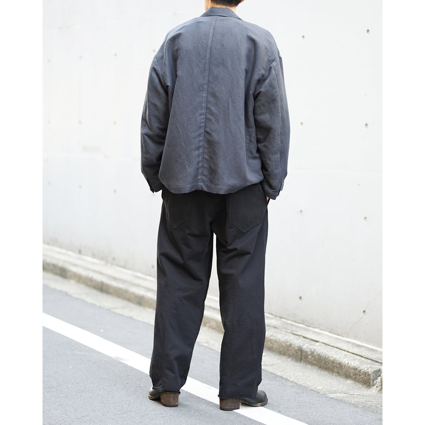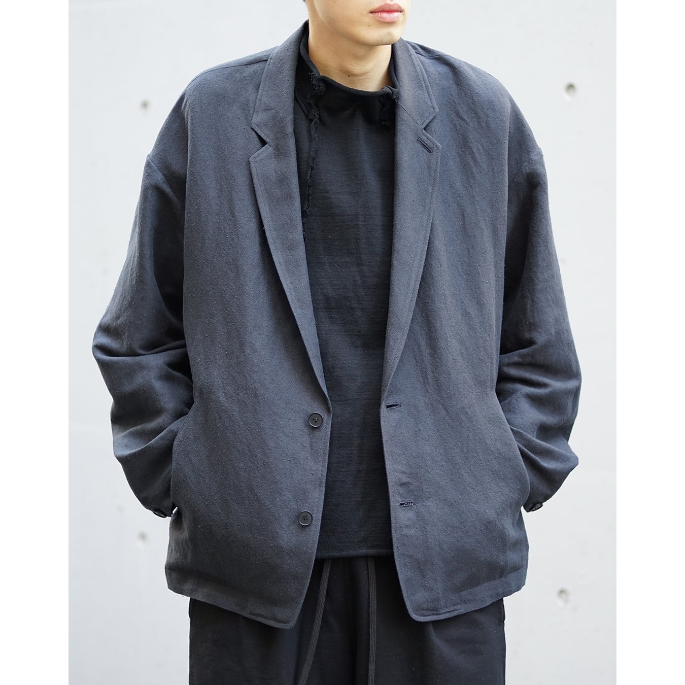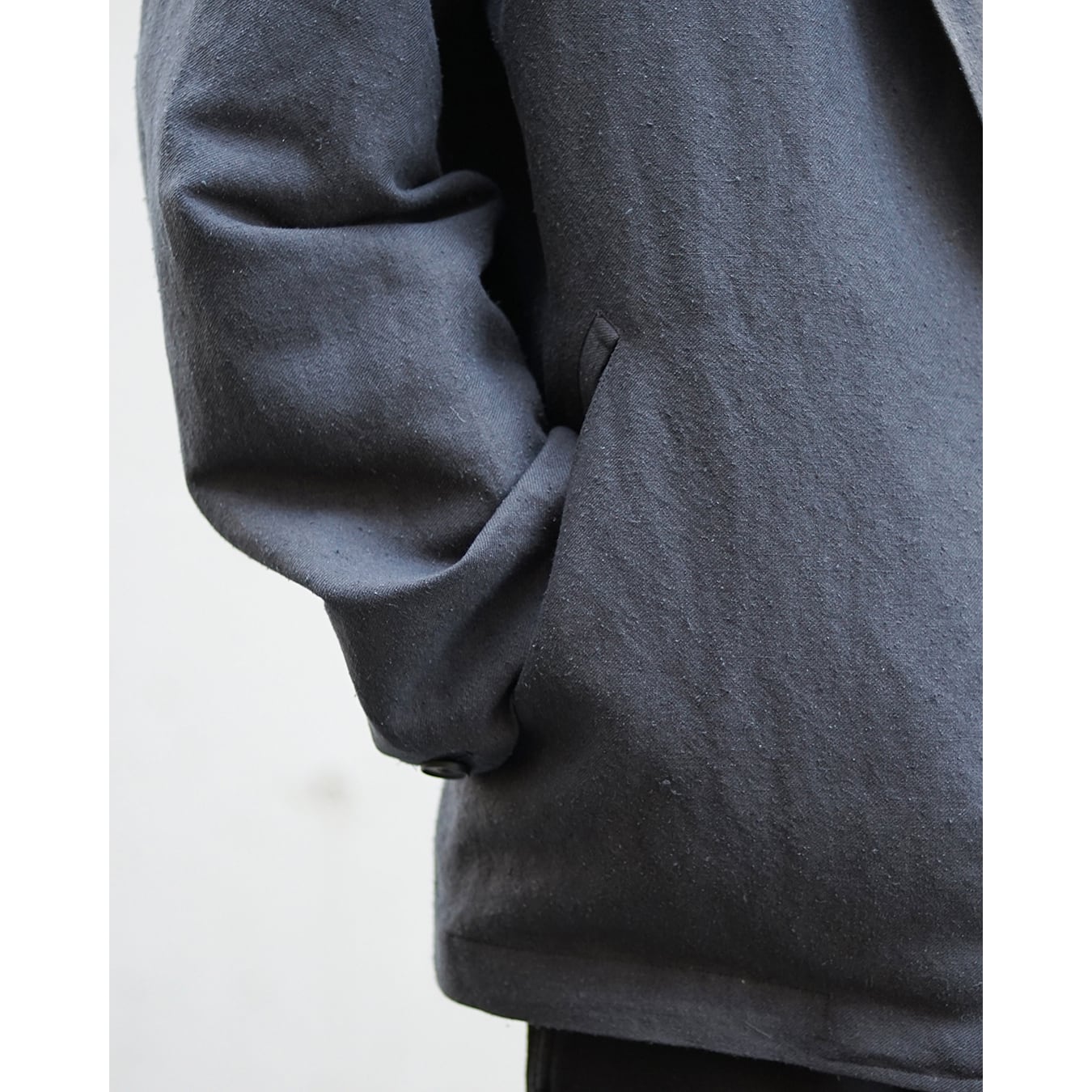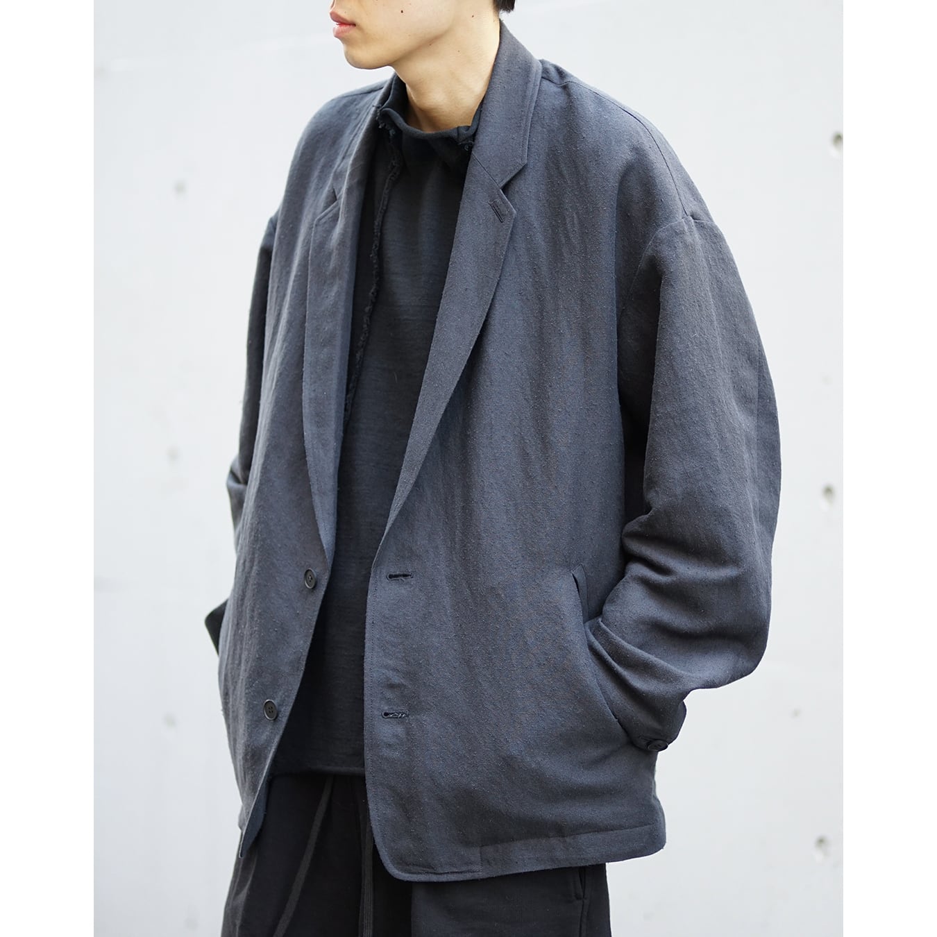 ボクシー型のフロントジップ JKT です。肩傾斜を適度に作りドロップショルダーデザイン。袖筒はパイロットJKT的なエルボー部分にボリュームを持たせています。裾にはスピンドルとストッパーを付属させ、ボクシーなシルエットからより曲線的なアウトラインへと変化させる事ができます。あわせて逆開のファスナー仕様でスタイリングに変化を加えます。