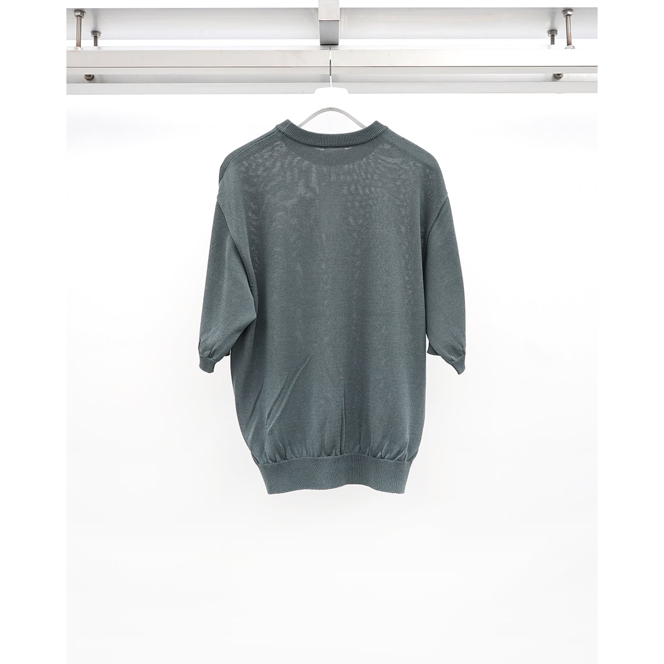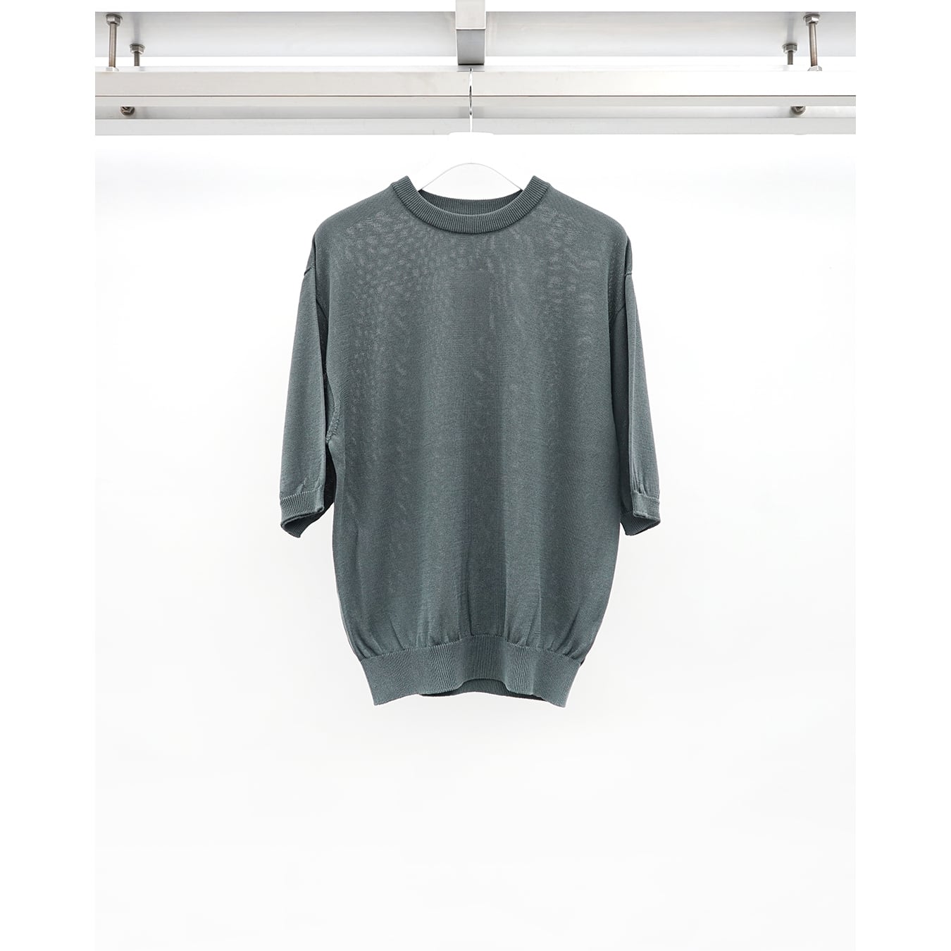 山形県の老舗ニットメーカーにて作成したホールガーメント仕様のニットTシャツです。綿糸にポリエステル長繊維をカバーリングした複合糸を使用。天然系デオドラント加工「ロンフレッシュ」が付与され、抗菌防臭効果を発揮し、吸収、速乾にも優れた糸。巷にあるニット T ですとなかなか昨今の真夏は難しいですが、機能糸を使用し、ホールガーメント仕様で作成したこちらのプロダクトは高温多湿な日本の機構でも活躍します。カットソーとの重ね着も可能な AH の広さです。勿論家庭での洗濯も可能。 よりニットらしさを持たせるために、襟付けはダブルのリンキングで強度を持たせ、裾と袖口には適度なテンションのリブが付属します。シルエットはゆとりあるボックスシルエット。SS シーズンは勿論、その他のシーズンもインナー使いが可能で、汎用性の高い 1 着です。