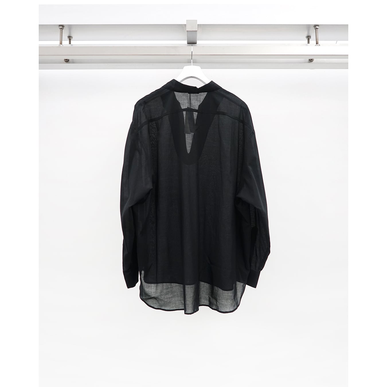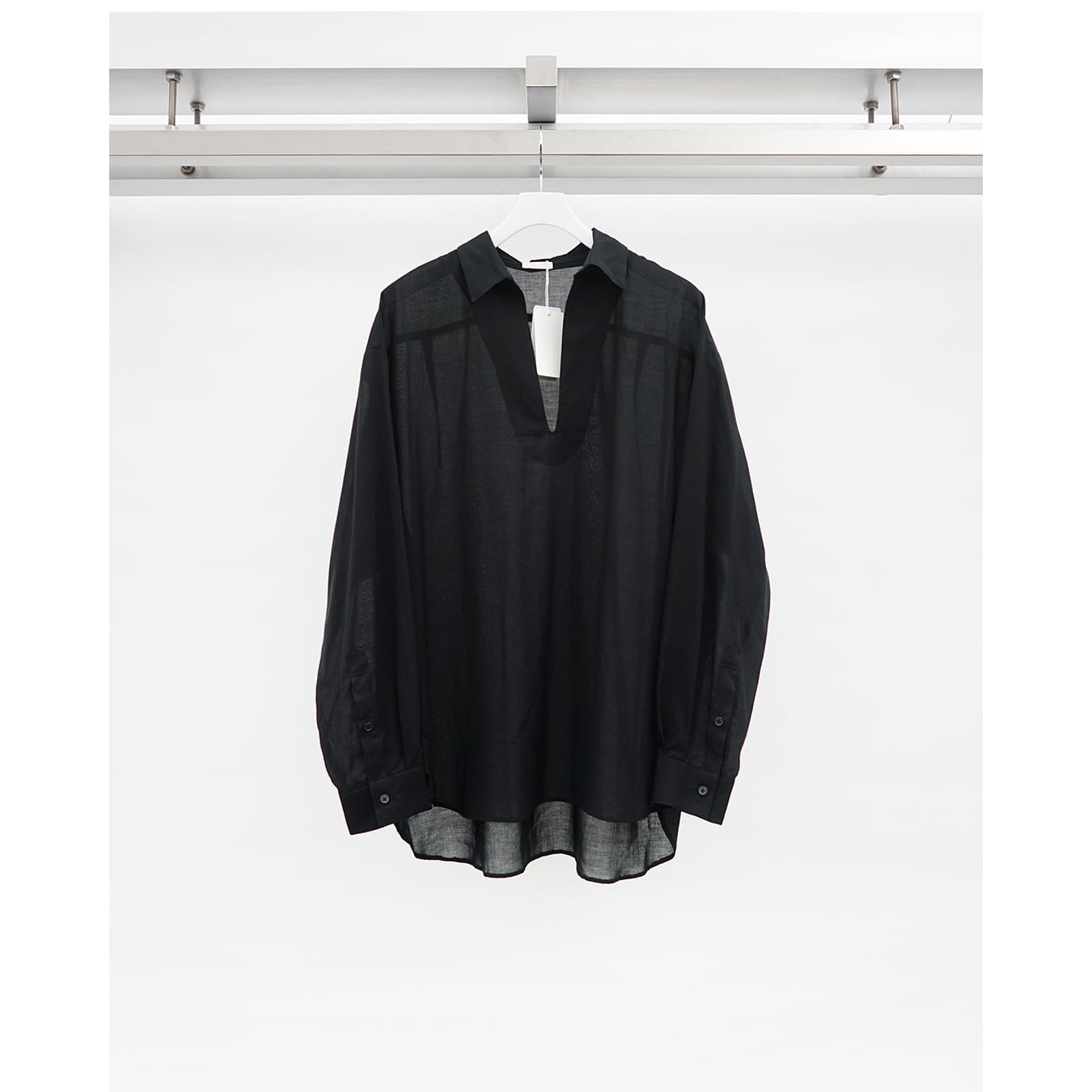 静岡の遠州地方で織られた100%コットン生地を使用。糸はスーピマ超長綿。ほんの僅かに毛羽を残した柔らかな質感とスーピマコットン特有の光沢があり、光を通す様な適度な透け感があります。洗い晒しで着用しても馴染む程良いシワ感で着用できる素材です。またとても計量な素材でSSシーズンのレイヤードとしてはストレスフリーです。