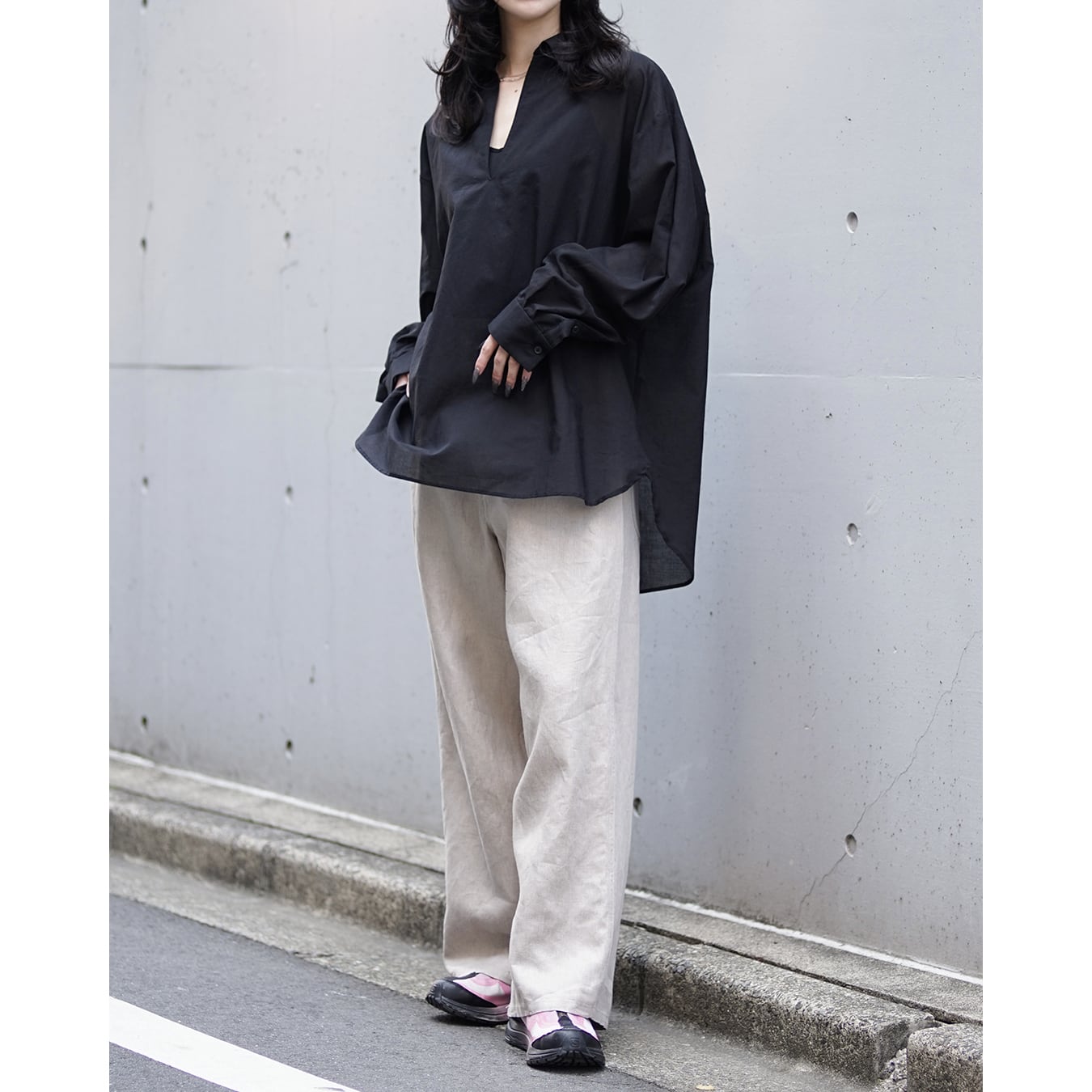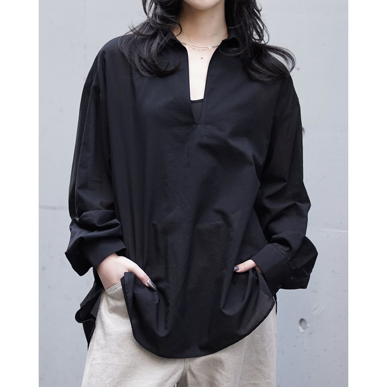 Blanc YM 定番のスキッパーシャツ。ワイドシャツ同様に後ろ身頃は通常よりもやや大きめにとり、横、後ろ姿はシャツの範疇ながライトアウターの様な雰囲気もございます。襟元は程良い空き具合でインナー次第で見え方も変わる為スタイリングの幅があります。また切り替えも無く、ステッチも極力抑え、柔らかな生地がドレープする仕様が魅力です。