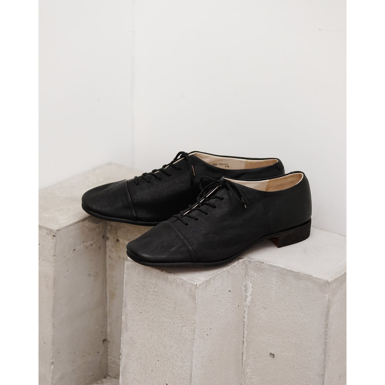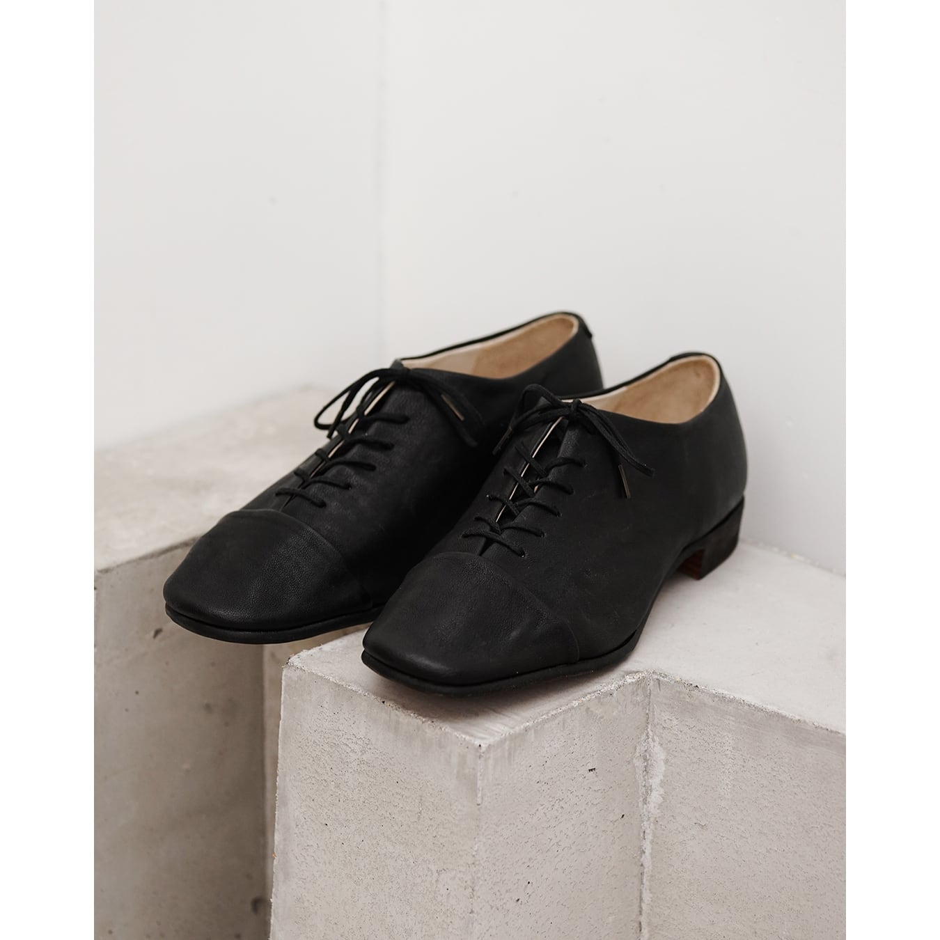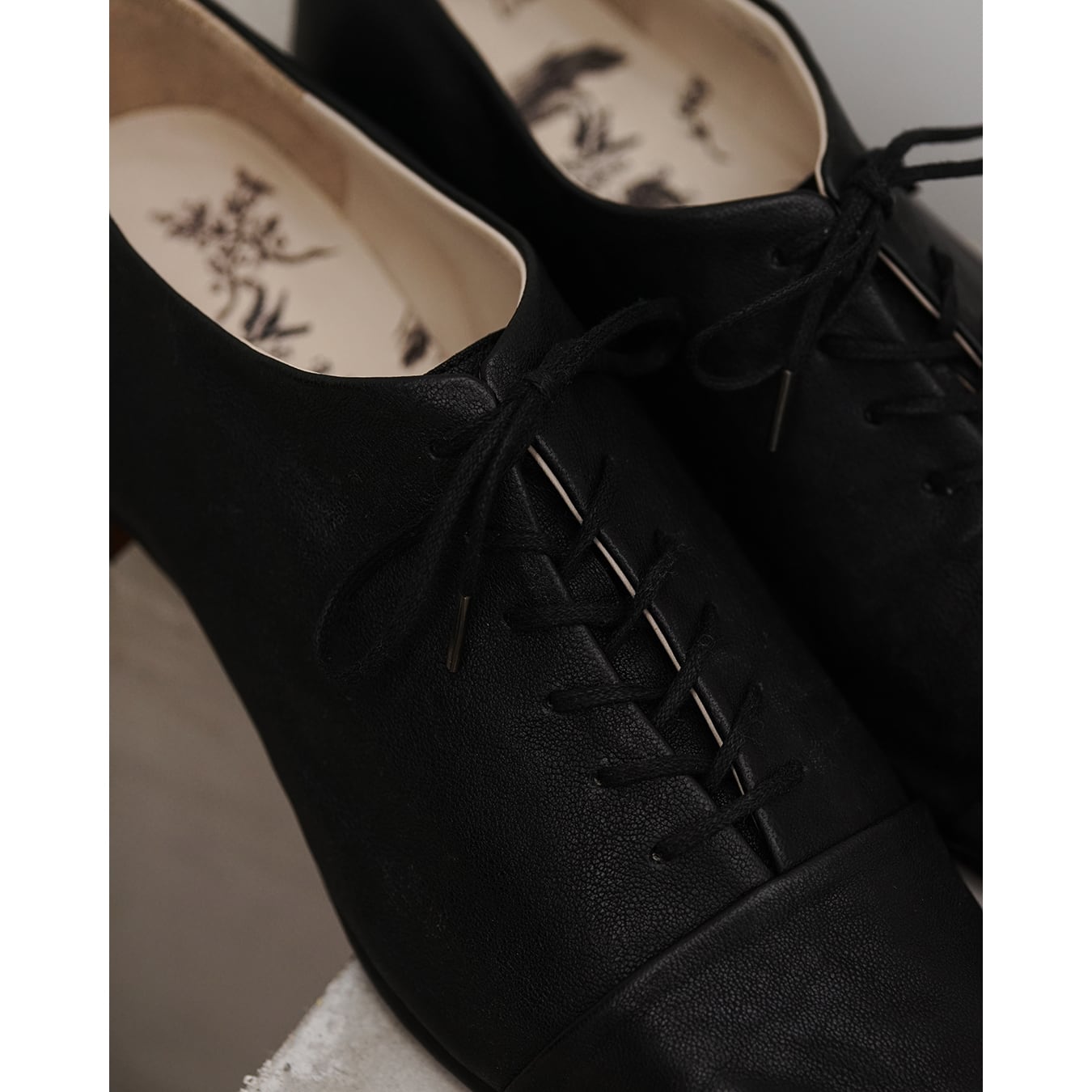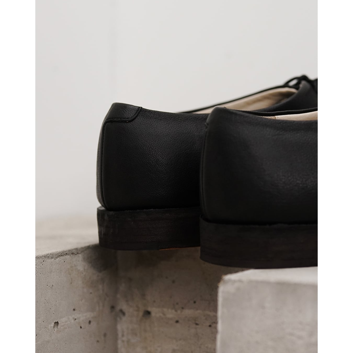 ストレートチップと華奢なシューレースによるエレガントかつミニマルなデザイン。
