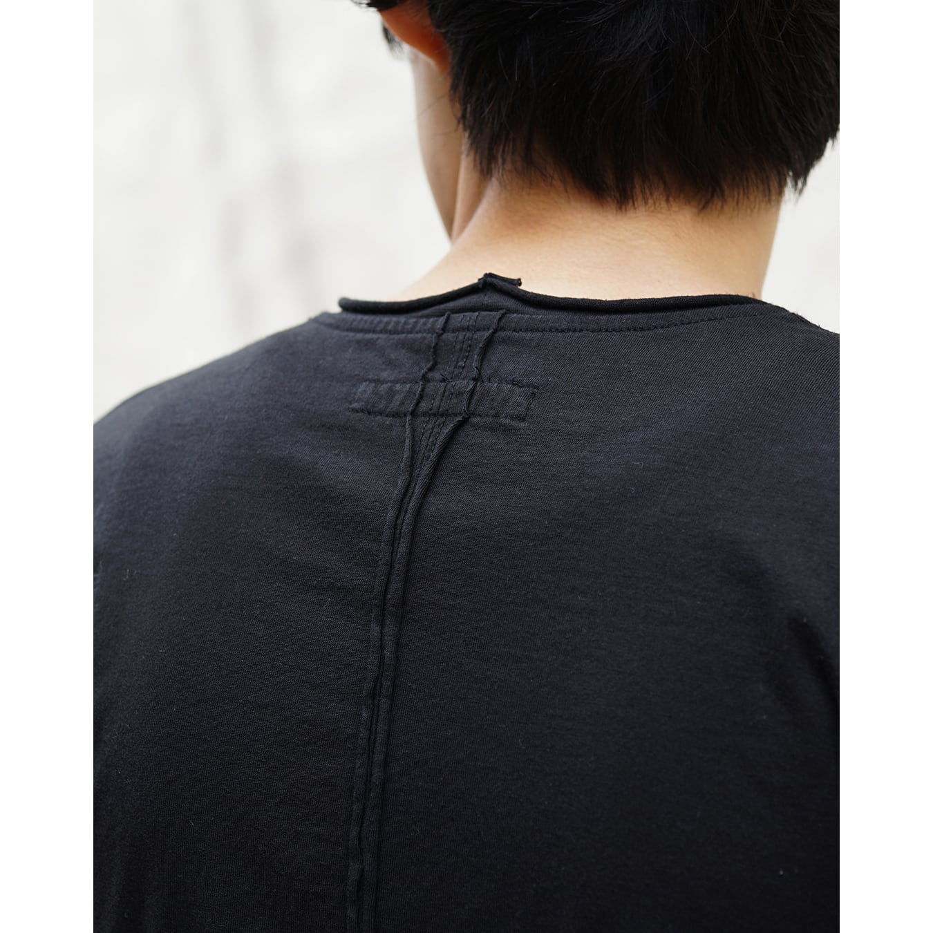 ネックバンド、袖口、裾、バックシームはすべてロールした断ち切りエッジ仕様。