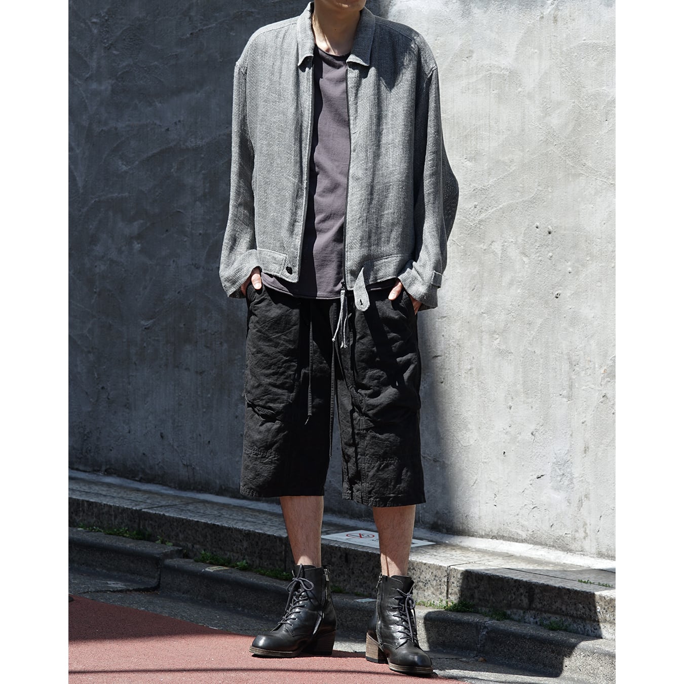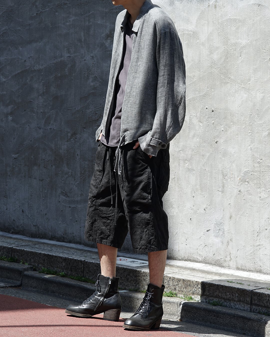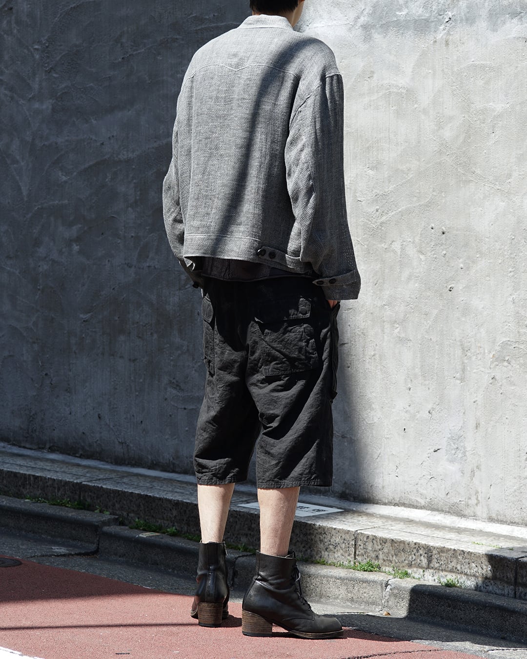 さらにその上から顔料によるガーメントオーバーダイとハンドワックス加工を施すことで、深みのある不均一なトーンを形成。着用を重ねることで経年変化し、より豊かな表情へと育っていきます。